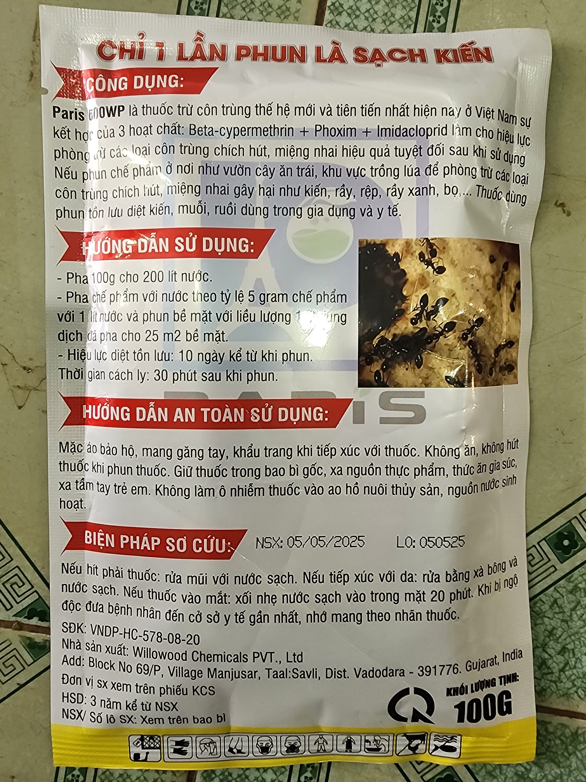 | Hướng dẫn sử dụng | Pha loãng (nếu cần) và phun trực tiếp lên đường đi của kiến, tổ kiến hoặc nơi nghi có tổ |