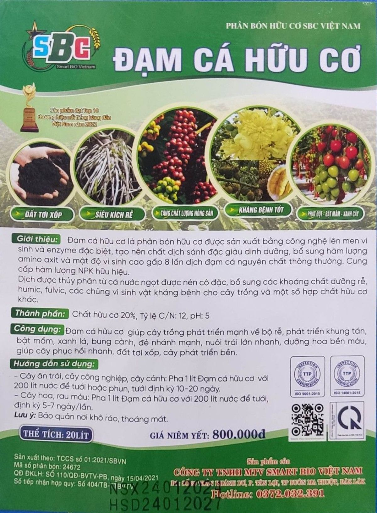Đạm cá cô đặc SBC là phân bón hữu cơ sinh học cao cấp, được sản xuất từ nguồn cá biển nguyên chất, thông qua công nghệ lên men vi sinh hiện đại. Sản phẩm chứa hàm lượng đạm tự nhiên cao, giàu acid amin, enzyme, khoáng chất vi lượng, giúp cây trồng phát triển mạnh, tăng sức đề kháng và cải tạo đất hiệu quả.