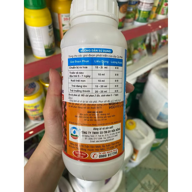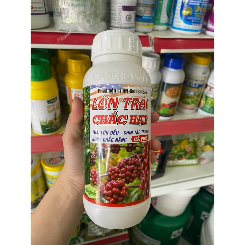 Lớn trái chắc hạt cà phê 500ml là chế phẩm sinh học chuyên dùng trong giai đoạn nuôi trái, giúp trái cà phê phát triển đồng đều, chắc nhân, tăng trọng lượng, chín tập trung và đạt chất lượng thương phẩm cao. Sản phẩm đã được nhiều nhà vườn tin dùng nhờ hiệu quả rõ rệt chỉ sau vài lần sử dụng.