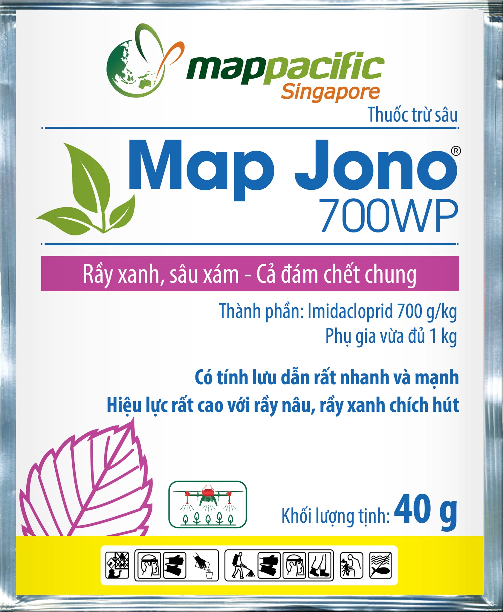 Map Jono 700WP là sản phẩm thuốc trừ sâu của Mappacific Singapore, nổi tiếng với khả năng đặc trị rầy xanh, rầy nâu, sâu xám và nhiều loại côn trùng chích hút. Với hoạt chất Imidacloprid 700 g/kg, thuốc có tính lưu dẫn mạnh, hiệu quả nhanh, giúp bảo vệ cây trồng an toàn và bền vững.