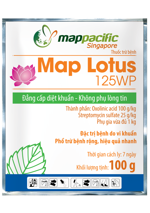 MAP LOTUS 125WP là thuốc trừ bệnh cao cấp của Mappacific, được nghiên cứu và phát triển với công nghệ hiện đại, mang đến hiệu quả vượt trội trong phòng và trị các bệnh hại phổ biến trên cây trồng. Với cơ chế lưu dẫn mạnh – thấm sâu nhanh – hiệu lực kéo dài, MAP LOTUS được bà con tin dùng trên nhiều loại cây trồng, từ lúa, rau màu đến cây ăn trái.