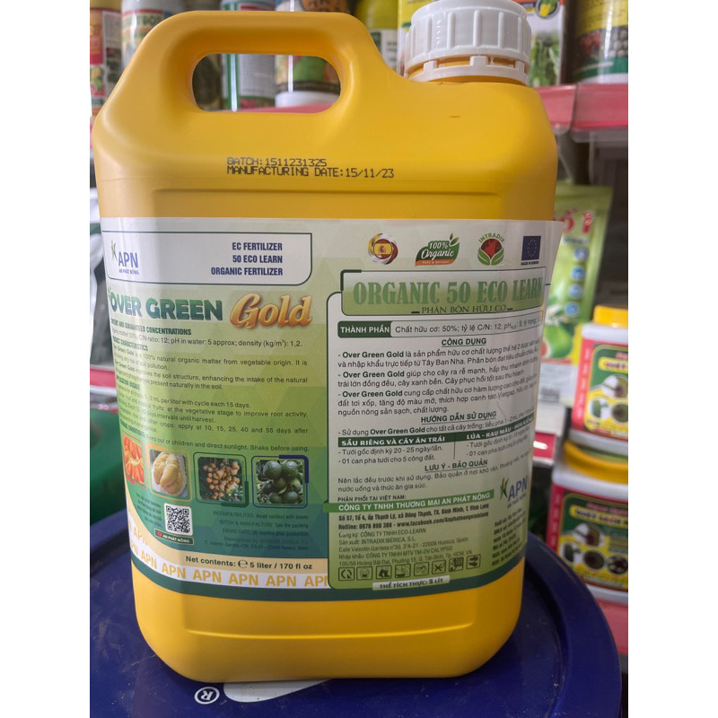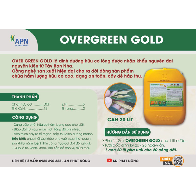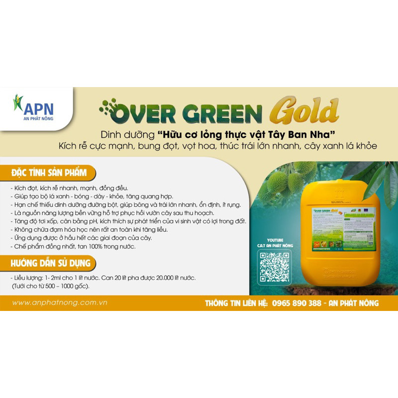 Over Green Gold là sản phẩm hữu cơ chất lượng thế hệ 2 được sản xuất và nhập khẩu trực tiếp từ Tây Ban Nha theo m chất lượng chuẩn châu Âu, giúp cho cây ra rễ mạnh, hấp thu nhanh dinh dưỡng, trái lớn đồng đều, cây xanh bền. Cây phục hồi tốt sau thu hoạch.
