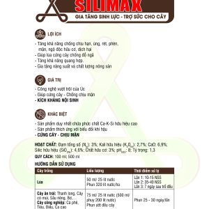 Silimax là sản phẩm sinh học cao cấp của Tập đoàn Lộc Trời, chứa silic và các vi lượng thiết yếu, giúp cây trồng cứng cáp, tăng sức chống chịu trước sâu bệnh, gió bão và điều kiện bất lợi. Sản phẩm thích hợp cho nhiều loại cây trồng như lúa, cây ăn trái, rau màu, cà phê, hồ tiêu…, mang lại năng suất cao và chất lượng nông sản vượt trội.