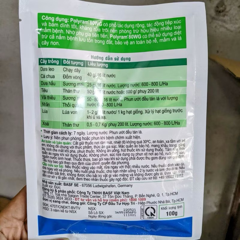 Polyram 80WG là thuốc trừ bệnh phổ rộng do tập đoàn BASF – Đức sản xuất, nổi bật với khả năng bảo vệ lá xanh, ngăn ngừa và phòng trừ nhanh các bệnh hại trên nhiều loại cây trồng. Với hoạt chất Metiram complex 800g/kg, sản phẩm có tác dụng mạnh mẽ trong việc kiểm soát các bệnh nấm hại, giúp cây sinh trưởng khỏe mạnh, nâng cao năng suất và chất lượng nông sản.