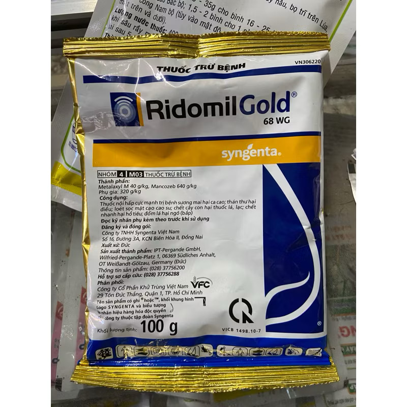 Ridomil Gold 100gr là thuốc trừ bệnh cao cấp được bà con nông dân tin dùng rộng rãi. Sản phẩm chứa hoạt chất Metalaxyl-M và Mancozeb, có phổ tác động rộng, giúp phòng và trị các bệnh do nấm hại trên nhiều loại cây trồng.
