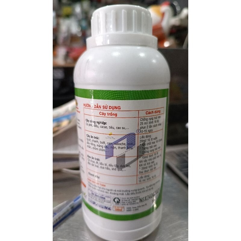 Cách dùng: 15ml/ bình 16 lít khi cây nhú chồi hoa và khi có trái non. 20 ml/ bình 16 lít giai đoạn trái lớn