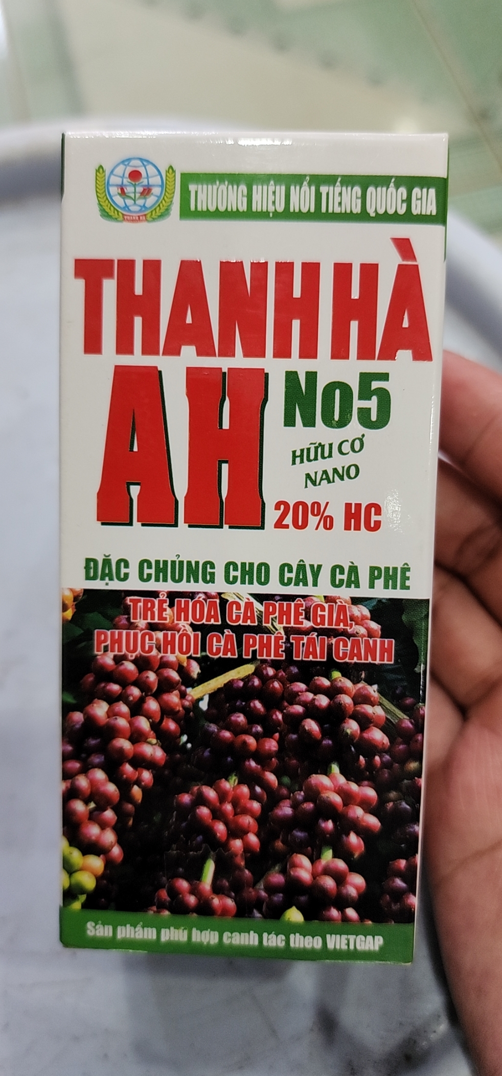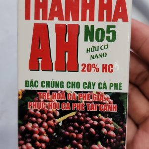 AH NO5 Thanh Hà 20%HC là dòng phân bón hữu cơ nhiều thành phần được nghiên cứu chuyên biệt cho cây cà phê, với công thức kết hợp giữa Amino Acid và chiết xuất rong biển (Seaweed). Sản phẩm giúp trẻ hóa cà phê già, phục hồi cà phê tái canh, kích thích ra rễ mạnh, nuôi trái lớn và bền cây lâu dài.